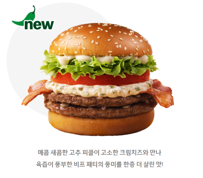 패티2장에 베이컨 풍미가 좀 더 있으면서 크림치즈의 달콤하면서 그 약간 느끼한 부분에 고추가 아주 살짝 갈려서 들어가 있어서 다 씹어넘길때쯤 고추가 있구나 라고 알 수 있는 작은 알갱이의 식감으로 고추를 느낄 수 있었고요!